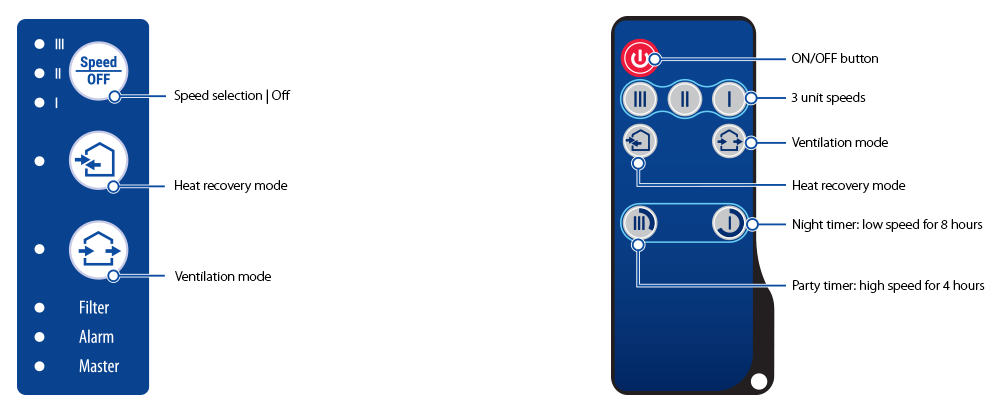 GREIČIAI: 3 greičiai; našumas rekuperacijos režime – 8/18/25 m³/val., našumas vėdinimo režime – 15/35/50 m³/val.