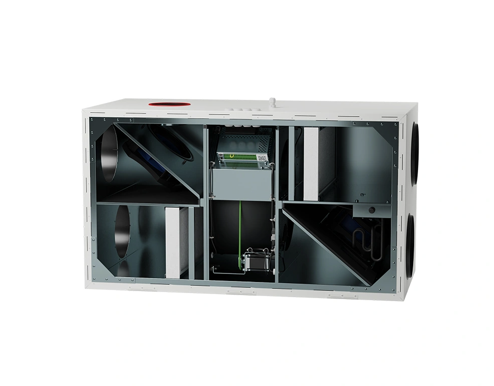 - Entalpinis-sorbcinis rotacinis šilumogrąžis su ceolitine danga efektyviai taupo šilumą ir šaltį, palaiko komfortišką patalpų mikroklimatą, kontroliuoja drėgmę žiemą ir vasarą